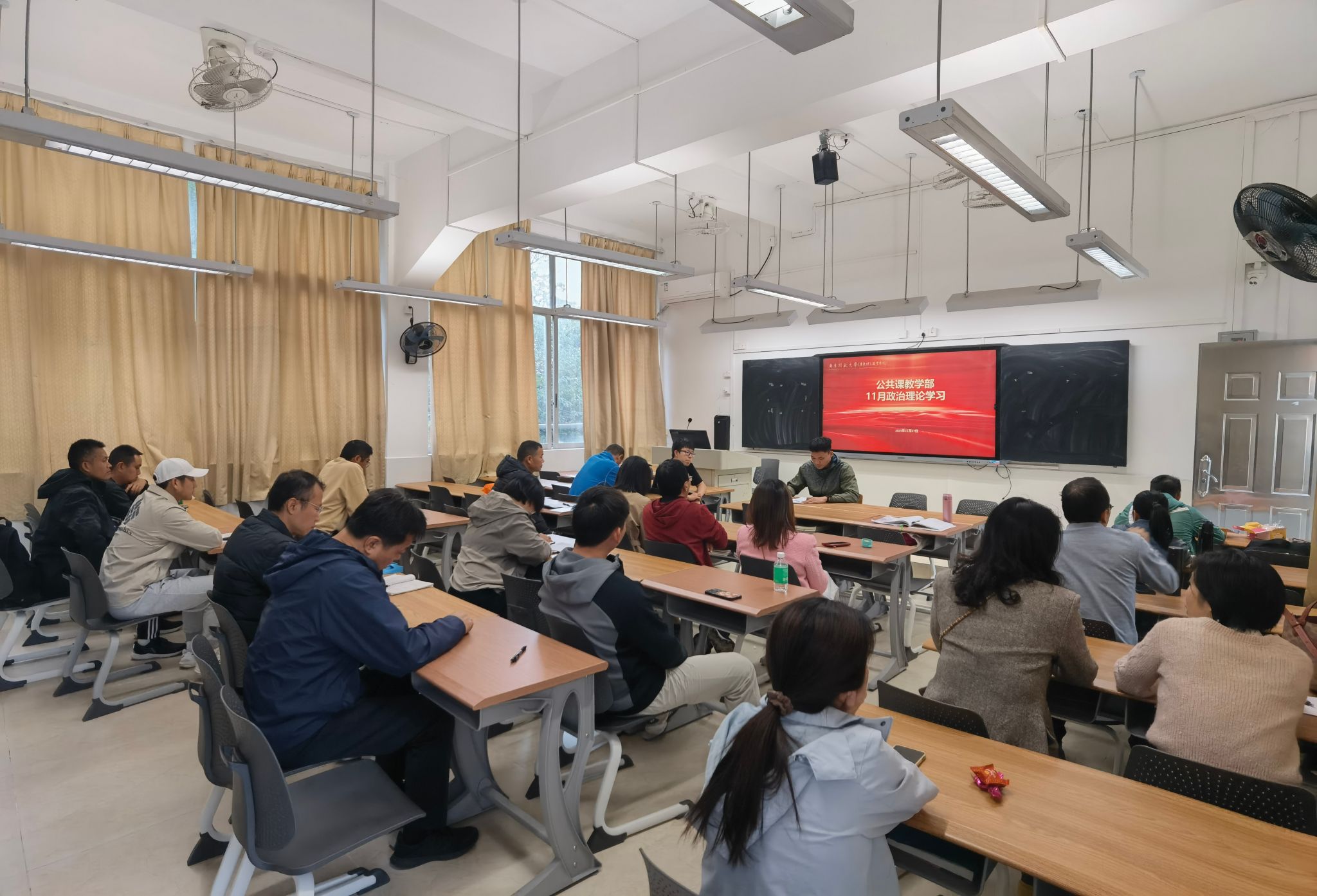 为深入贯彻党的二十届四中全会精神,进一步统一思想、凝聚共识,公共课教学部于11月27日组织全体教职工开展11月政治理论学习会。会议由梁国力副主任主持,全体教职工参加。