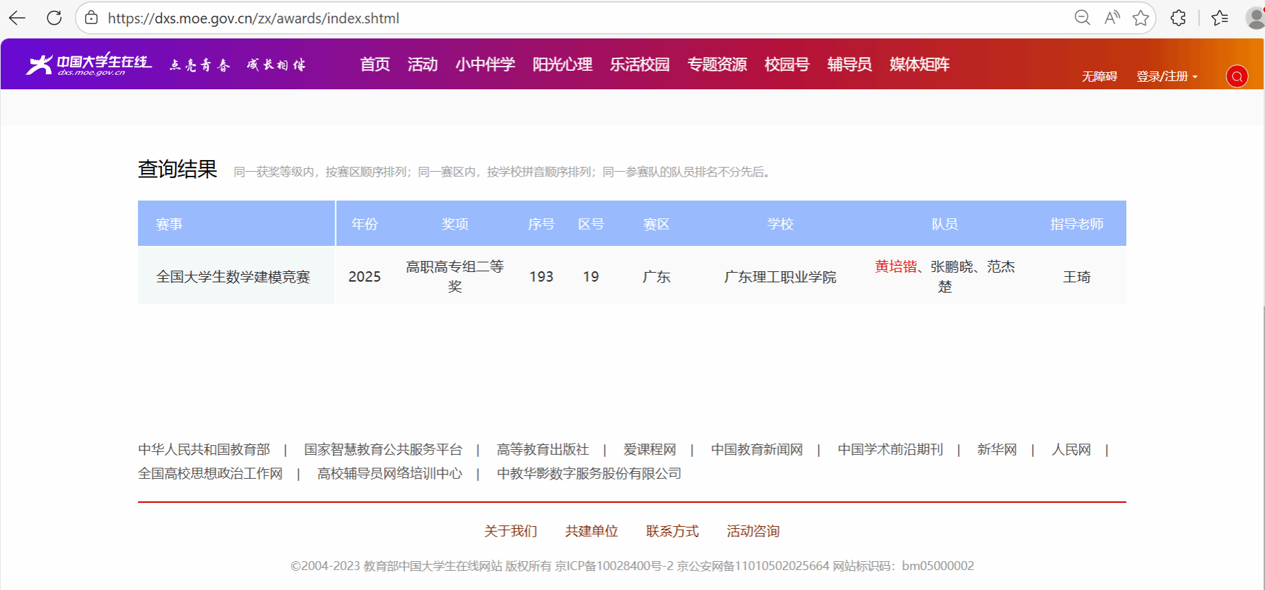 近日,2025年全国大学生数学建模竞赛全国赛区获奖名单揭晓。广东理工职业学院学子在高职(含职业本科)高专组比赛中表现突出,斩获全国一等奖和二等奖各1项,实现国赛奖项零的突破。同时,还获得省级一等奖2项,三等奖2项,优胜奖8项。王琦、王紫虹老师获广东省教育厅颁发的数学建模竞赛“优秀指导老师”。
