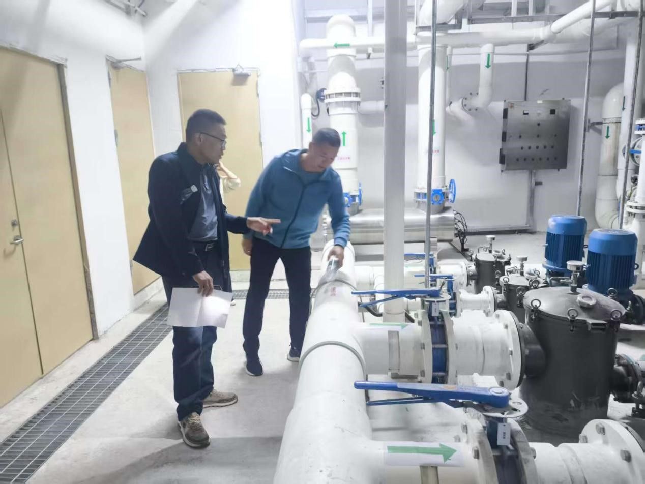 图二 朱华超副主任在游泳馆机房研讨水质循环系统设备
