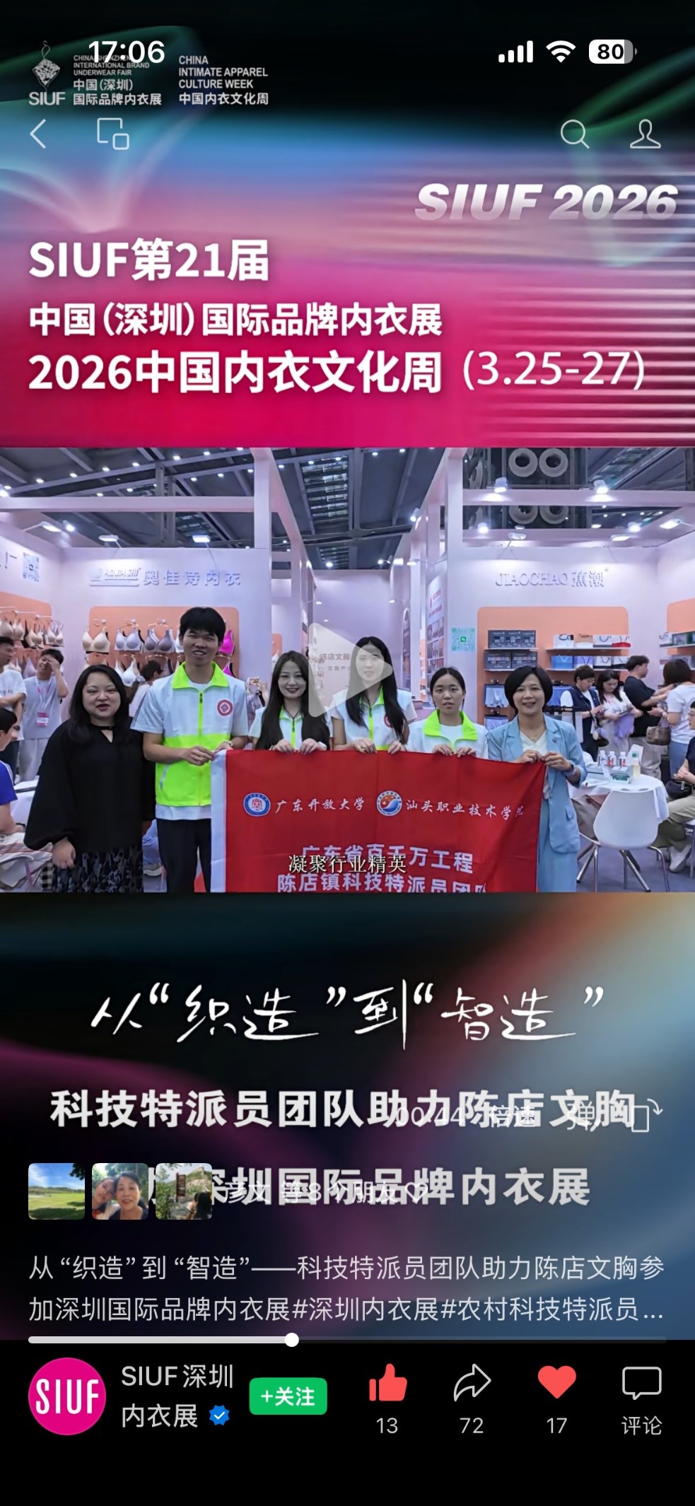 近日,来自广东开放大学与汕头职业技术学院联合组建的农村科技特派员团队,由王紫虹、沈秋雅、刘毅嘉三位老师带领学生志愿者,助力汕头市潮南区陈店文胸协会,先后参与第五届潮汕国际纺织服装博览会(3月18-20日)及第二十一届中国(深圳)国际品牌内衣展(3月25-27日)。团队立足服务地方产业,在现场宣传、行业调研、产学研对接及数字化平台推广等方面开展系列助力工作,为陈店内衣产业高质量发展提供科技支撑。